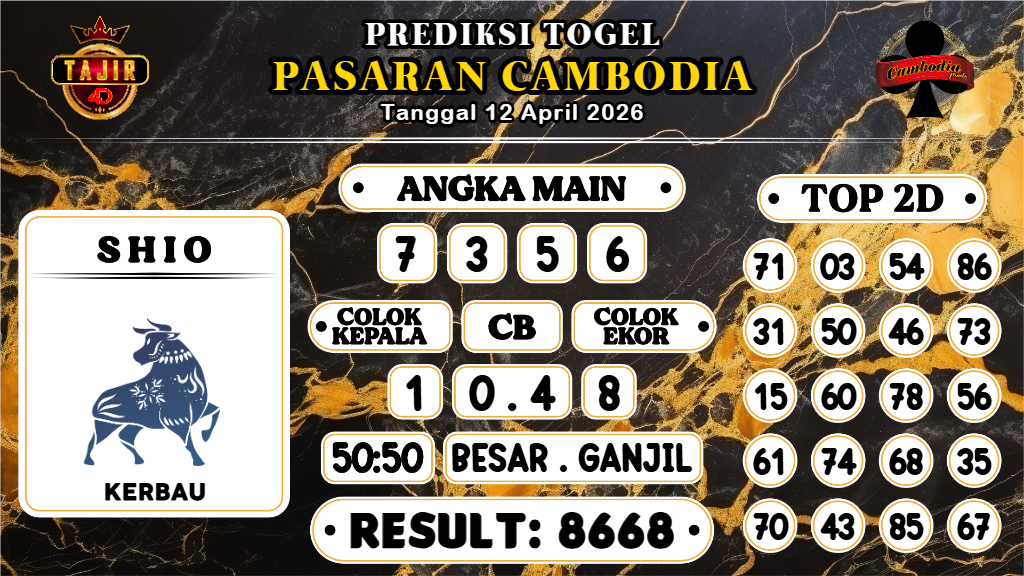 Prediksi yang bagus dan jitu harus dimainkan hanya pada Bandar Togel Terpercaya. Mengapa? Karena banyak sekali Bandar Togel Online di luar sana yang tidak bertanggungjawab atau biasa disebut Bandar Rampok. Untuk itu Kami Prediksi Boss sangat merekomendasikan Agen Togel Online Tajir4D yang sudah sangat terpercaya sejak 2015 dan sudah ribuan member berhasil withdraw dengan nominal Ratusan juta setiap harinya. Demikianlah Prediksi Kamboja Hari Minggu 12 April 2026