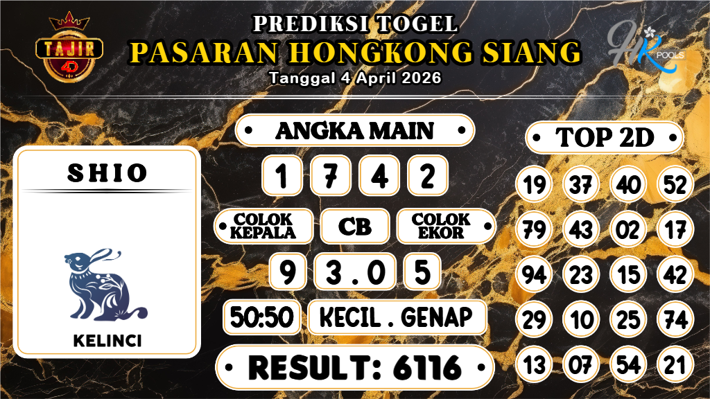 Prediksi yang bagus dan jitu harus dimainkan hanya pada Bandar Togel Terpercaya. Mengapa? Karena banyak sekali Bandar Togel Online di luar sana yang tidak bertanggungjawab atau biasa disebut Bandar Rampok. Untuk itu Kami Prediksi Boss sangat merekomendasikan Agen Togel Online Tajir4D yang sudah sangat terpercaya sejak 2015 dan sudah ribuan member berhasil withdraw dengan nominal Ratusan juta setiap harinya. Demikianlah Prediksi HK Siang hari Ini Sabtu 4 April 2026