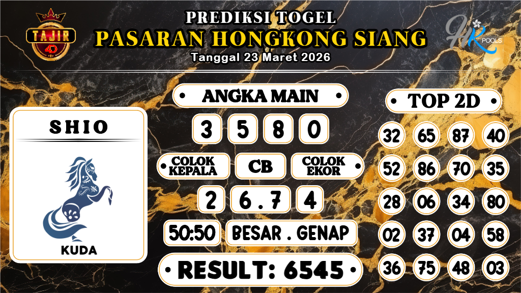 Prediksi yang bagus dan jitu harus dimainkan hanya pada Bandar Togel Terpercaya. Mengapa? Karena banyak sekali Bandar Togel Online di luar sana yang tidak bertanggungjawab atau biasa disebut Bandar Rampok. Untuk itu Kami Prediksi Boss sangat merekomendasikan Agen Togel Online Tajir4D yang sudah sangat terpercaya sejak 2015 dan sudah ribuan member berhasil withdraw dengan nominal Ratusan juta setiap harinya. Demikianlah Prediksi HK Siang hari Ini Senin 23 Maret 2026