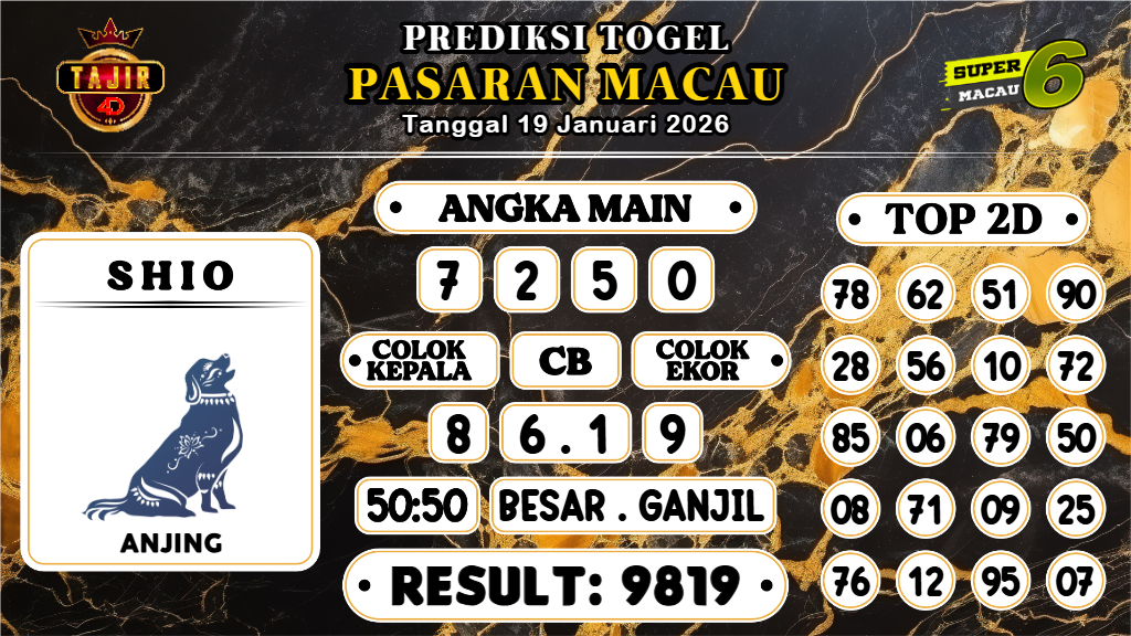 Prediksi yang bagus dan jitu harus dimainkan hanya pada Bandar Togel Terpercaya. Mengapa? Karena banyak sekali Bandar Togel Online di luar sana yang tidak bertanggungjawab atau biasa disebut Bandar Rampok. Untuk itu Kami Prediksi Boss sangatsssss merekomendasikan Agen Togel Online Tajir4D yang sudah sangat terpercaya sejak 2015 dan sudah ribuan member berhasil withdraw dengan nominal Ratusan juta setiap harinya. Demikianlah Prediksi Macau Hari Ini Senin 19 Januari 2026 yang diberikan di atas. Salam Jackpot!