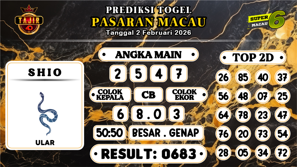 Prediksi yang bagus dan jitu harus dimainkan hanya pada Bandar Togel Terpercaya. Mengapa? Karena banyak sekali Bandar Togel Online di luar sana yang tidak bertanggungjawab atau biasa disebut Bandar Rampok. Untuk itu Kami Prediksi Boss sangatsssss merekomendasikan Agen Togel Online Tajir4D yang sudah sangat terpercaya sejak 2015 dan sudah ribuan member berhasil withdraw dengan nominal Ratusan juta setiap harinya. Demikianlah Prediksi Macau Hari Ini Senin 2 Februari 2026 yang diberikan di atas. Salam Jackpot!
