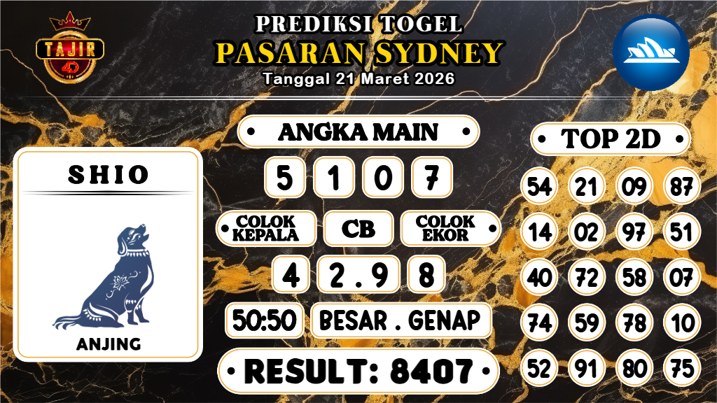 Prediksi yang bagus dan jitu harus dimainkan hanya pada Bandar Togel Terpercaya. Mengapa? Karena banyak sekali Bandar Togel Online di luar sana yang tidak bertanggungjawab atau biasa disebut Bandar Rampok. Untuk itu Kami Prediksi Boss sangat merekomendasikan Agen Togel Online Tajir4D yang sudah sangat terpercaya sejak 2015 dan sudah ribuan member berhasil withdraw dengan nominal Ratusan juta setiap harinya. Demikianlah Prediksi Sydney Hari Ini Sabtu 21 Maret 2026