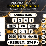 Prediksi Macau Togel 13 Desember 2025 Prediksi Boss macau hari ini yang kami berikan hari ini pastinya sudah berdasarkan rumus dari Master Togel serta Suhu yang sangat berpengalaman di Bidang Toto Gelap. Angka Keluaran togel yang kami berikan juga sangat Jitu dan Akurat bukan Abal-abal karena kami hanya memberikan Angka Jitu yang Pasti Keluar. Syair […]