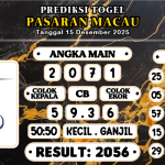 Prediksi Macau Togel 15 Desember 2025 Prediksi Boss macau hari ini yang kami berikan hari ini pastinya sudah berdasarkan rumus dari Master Togel serta Suhu yang sangat berpengalaman di Bidang Toto Gelap. Angka Keluaran togel yang kami berikan juga sangat Jitu dan Akurat bukan Abal-abal karena kami hanya memberikan Angka Jitu yang Pasti Keluar. Syair […]