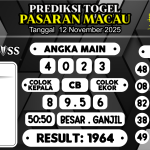 Prediksi Macau Togel 12 November 2025 Prediksi Boss macau hari ini yang kami berikan hari ini pastinya sudah berdasarkan rumus dari Master Togel serta Suhu yang sangat berpengalaman di Bidang Toto Gelap. Angka Keluaran togel yang kami berikan juga sangat Jitu dan Akurat bukan Abal-abal karena kami hanya memberikan Angka Jitu yang Pasti Keluar. Syair […]